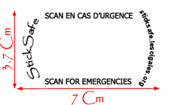 L'impression des stickers StickSafe sont noirs sur fond blanc pour la visibilité. Vous aurez le choix entre 2 types de présentation du StickSafe dont les dimensions sont :